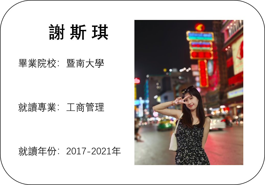 作為過來人,我建議學弟學妹們,在校期間,盡量多參與學生活動以及比賽,不論是否得獎,經驗以及與人相處的技巧都是非常重要!記住要自己創造機會,你自己去選擇機會,不要等機會選擇你,讓自己擁有主動權。