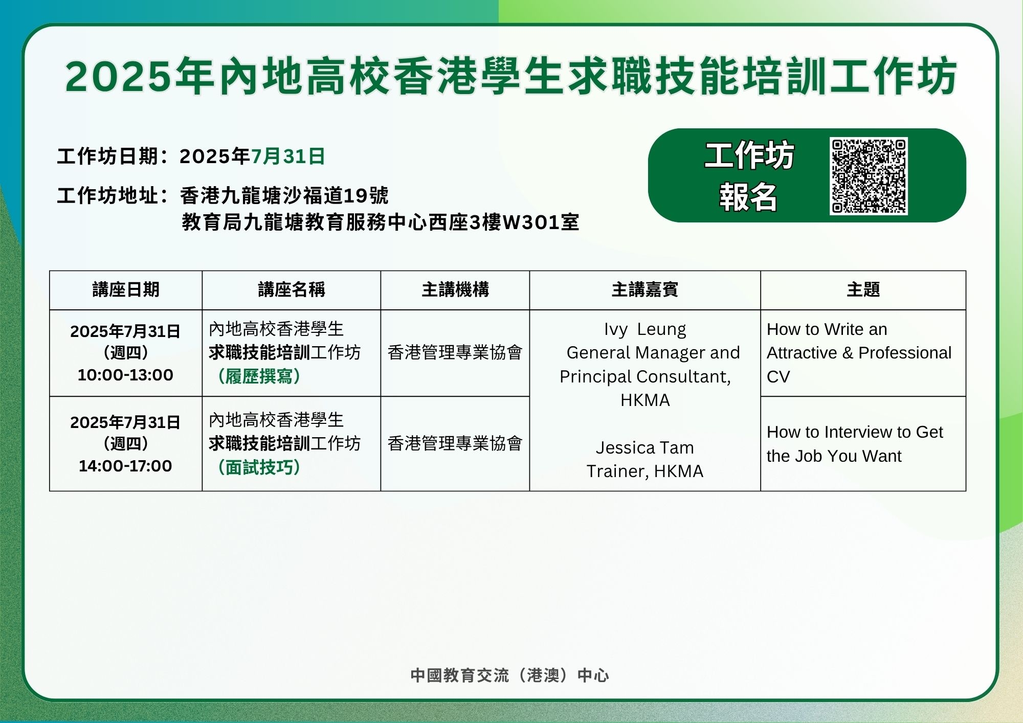 「2025年夏季內地高校香港學生就業輔導講座」和「求職技能培訓工作坊」報名進行中!
