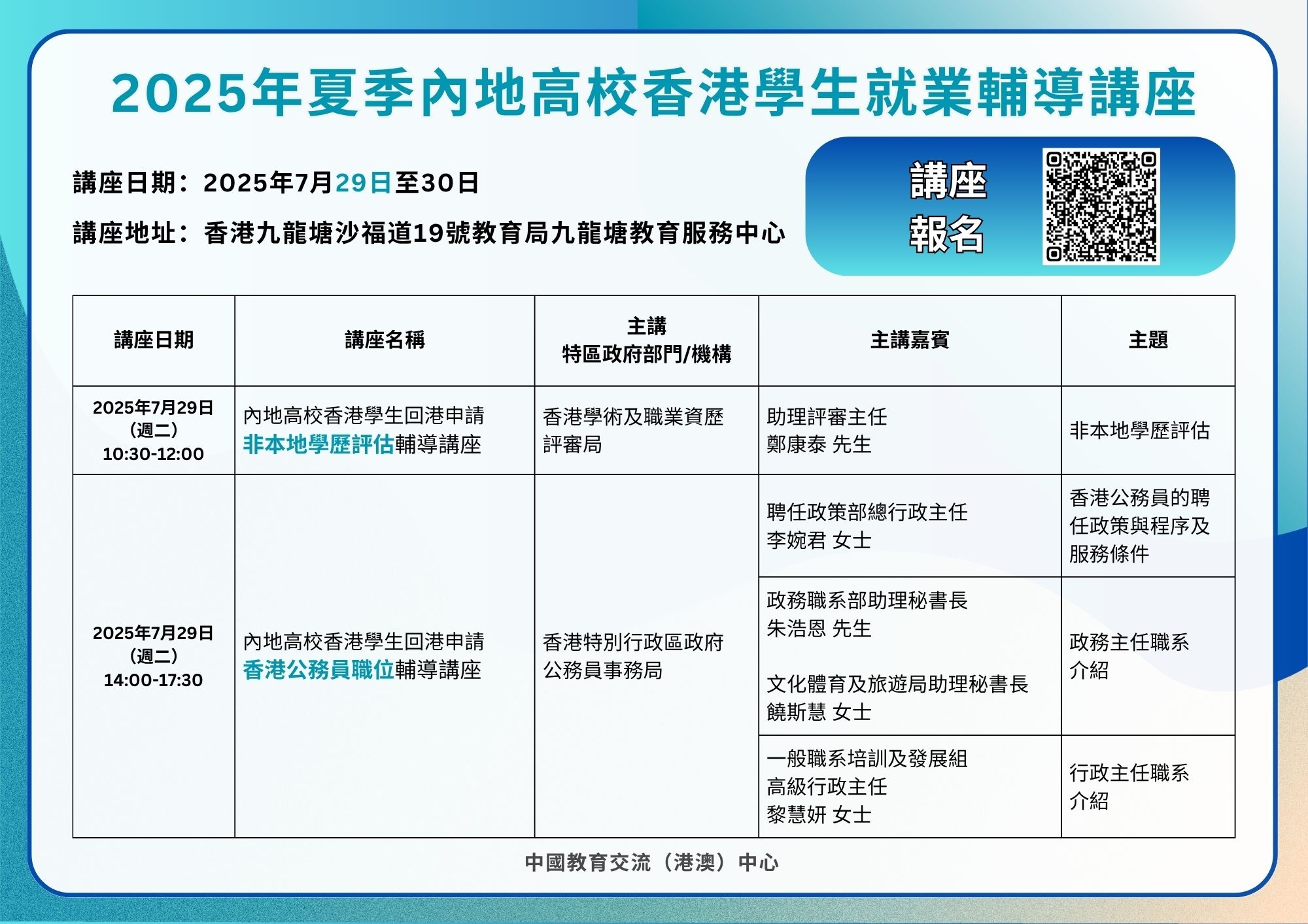 中國教育交流(港澳)中心特邀請了香港特別行政區政府公務員事務局、香港警務處、香港入境事務處、香港海關、香港消防處、香港懲教署及香港學術及職業資歷評審局代表於2025年7月29日至30日為內地高校在讀及畢業香港同學們舉辦「2025年夏季內地高校香港學生就業輔導講座」;並計劃於 2025年7月31日為內地高校香港學生首次舉辦「求職技能培訓工作坊」。屆時主講嘉賓會詳細講解內地高校香港學生回港申請香港公務員和紀律部隊職位和非本地學歷評估的資訊;以及由香港管理專業協會代表教授同學們簡歷撰寫及面試的實用技巧,並現場解答相關問題。