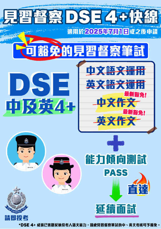 香港特別行政區政府香港警務處於七月一日推出「見習督察DSE 4+快線」。於香港中學文憑考試中國語文科和英國語文科取得第四級或以上的成績,或具同等學歷,並通過綜合招聘考試的能力傾向測試,將被視為通過見習督察筆試,可直接進入延續面試。這項措施有助加快遴選程序,讓達到上述要求的考生盡快加入警隊,加強警隊於就業市場吸引人才。