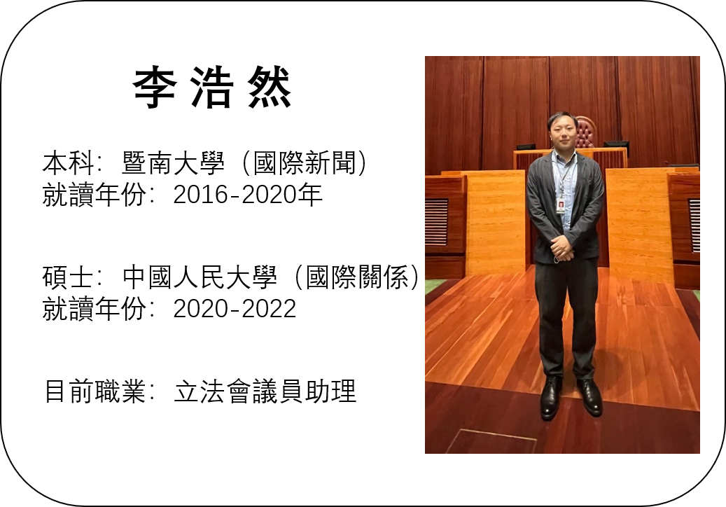就業經驗方面,我在分享了一些實用的就業渠道,例如提及了香港特別行政區政府現今正展開的新一輪「大灣區青年就業計劃」、香港中國企業協會設立的招聘網站,上面提供了在港各中資企業的招聘信息。