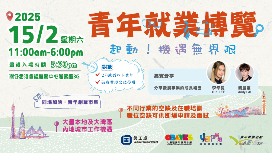 香港勞工處將於2025年2月15日在灣仔香港會議展覽中心舉辦「青年就業博覽」。博覽由勞工處的「大灣區青年就業計劃」、「展翅青年就業計劃」及「青年就業起點」聯合舉辦,為29歲或以下青年提供大量本地及大灣區內地城市工作機會,並介紹勞工處多元化的青年就業服務。